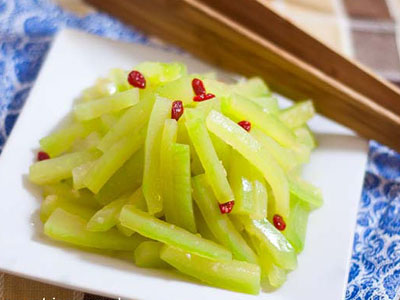 4.將西瓜皮、蒜茸、米醋、糖和香油拌勻即可,可以再加少許枸杞點綴。
