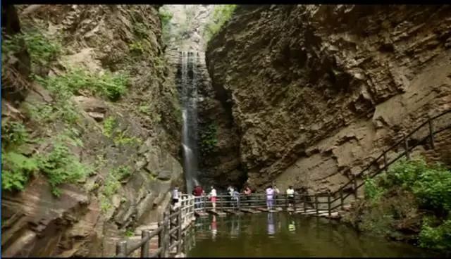 瀑布高達100余米,從井口水簾洞落下,形成了自然奇觀,漫步在棧道之上,便有穿云破霧之感。在這里,遠望可領略高山整體氣勢之壯美,近觀可品察,山石樹木形色質紋之奇秀。