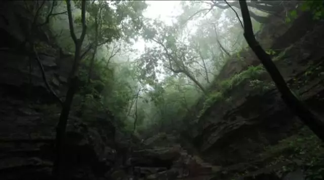 看到這棵樹了沒有,據說這個葉子有個奇特的味道,是一股橘子味,在這山上還有很多珍貴野生的樹種,漫山遍野一股清香襲來,再往前走就可以看到天井了,天井四面峭壁,犬牙交錯高深莫測。