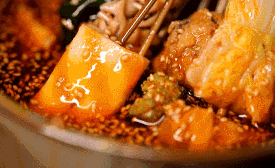 精心熬制四個小時的紅油,加了各種香料的冰鎮底湯,撒上用油炒的噴香的芝麻,合而為一才是冷鍋串的精髓,串串全部放入大缽缽中,再澆上香氣濃郁的料湯,食材吸收料湯后開始入味,浸泡的時間越久就越好吃,而最正宗的吃法還要加冰,想想這冰爽。