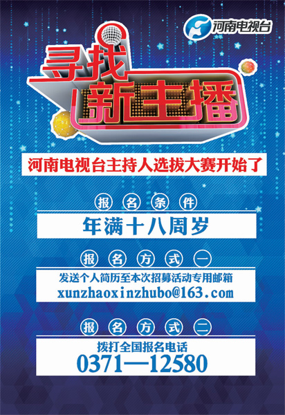 10月1日起,河南電視臺將啟動“尋找新主播”活動。這是由河南電視臺都市頻道承辦的一檔大型主持人選拔活動,選拔范圍輻射全國,無論你在哪里,無論你正在從事哪個行業,只要您年滿18周歲,沒準兒下一個“新主播”就是你!