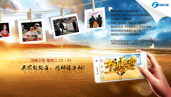 生活中某些情景在瞬間即能帶來感動,它適于簡潔有力地表現。感動隨手拍邀請您遇到生活的感動瞬間,或樂于助人,或見義勇為,或甘于奉獻,甚至只是讓你有所觸動的溫情瞬間,請隨手拍下照片或者視頻。河南衛視《中國感動》欄目將在結尾以集錦的形式播出。一旦被節目選上 登上節目播出就會有獲獎資格。