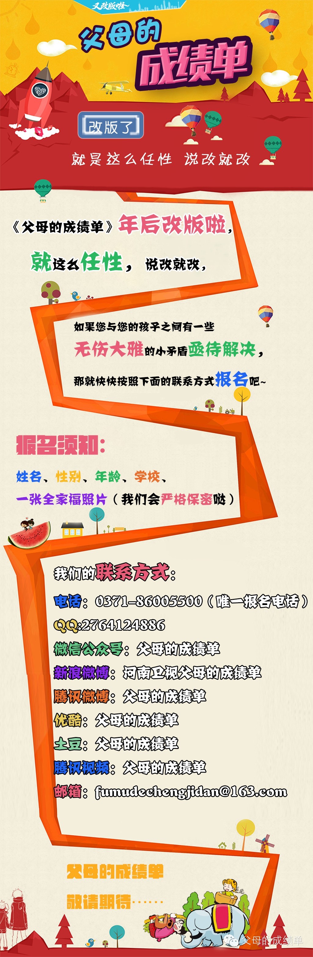 年后,經過導演大大和眾小編們的熱切商討,《父母的成績單》又改版啦。我們就是這樣任性,說改就改,為了什么?為了讓可敬可愛的觀眾朋友們看到更優質更具有內涵的節目,希望你們能喜歡我們的節目,能感受到我們每一位幕后工作者的用心付出。我們真誠的期望每一位家長都能耐心的用更好的方式來與您的孩子溝通相處,更期望每一位孩子都能健康快樂的成長。