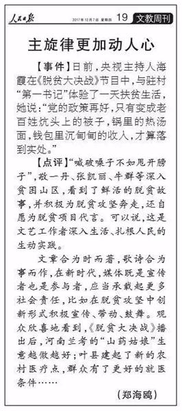 這在河南衛視媒體扶貧的歷程中不是孤例。海霞、任魯豫、水均益、趙普、鄧亞萍……這些以往只能在電視上看到的名人,和一大群扛著各種沉重器材的工作人員,跋山涉水來到地處偏遠的貧困村莊,和鄉親們一起拉家常,和干部們一起謀發展,和專家學者一起談脫貧。