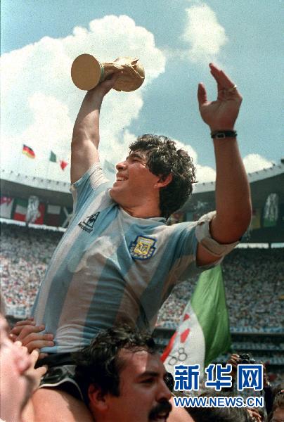 圖為1986年6月29日,馬拉多納高舉冠軍獎杯慶祝勝利。在1986年墨西哥世界杯決賽中,阿根廷隊以3比2戰勝聯邦德國隊奪得冠軍。新華社發