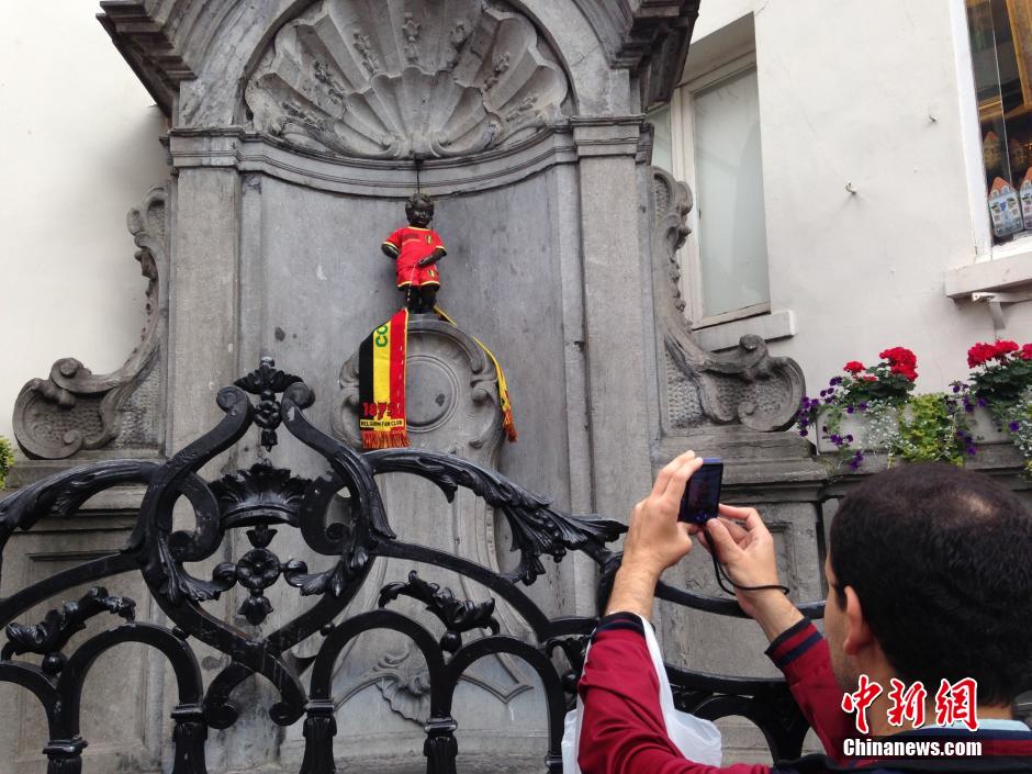 6月17日晚,歐洲“紅魔”比利時隊以2比1戰勝巴西世界杯首個對手阿爾及利亞隊。在比利時首都布魯塞爾,著名的城市標志“小尿童”于連雕像換上了比利時隊隊服,并圍上球迷圍巾,化身紅魔球迷支持比利時隊。