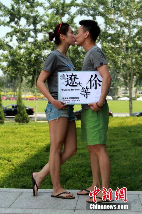6月23日,情侶拿著“我在遼大等你!的牌子在拍照。當(dāng)日,遼寧大學(xué)攝影協(xié)會推出一組遼大創(chuàng)意“招生名片”的圖片,數(shù)位帥哥靚妹抓人眼球。中新社發(fā) 于海洋 攝