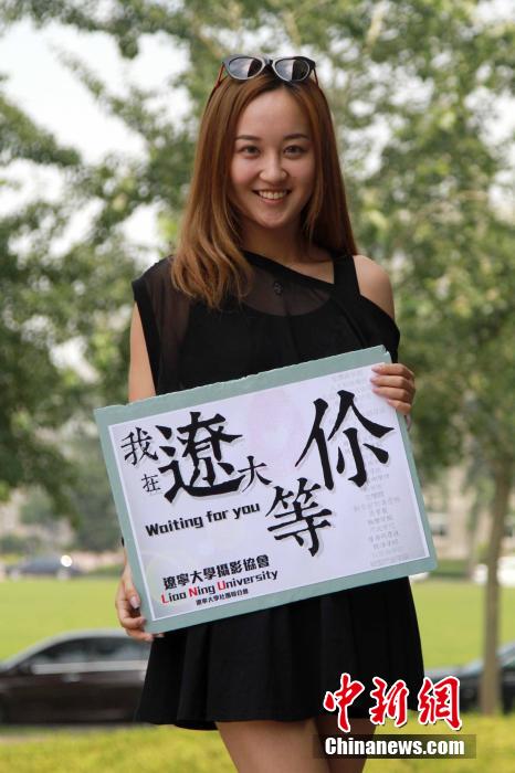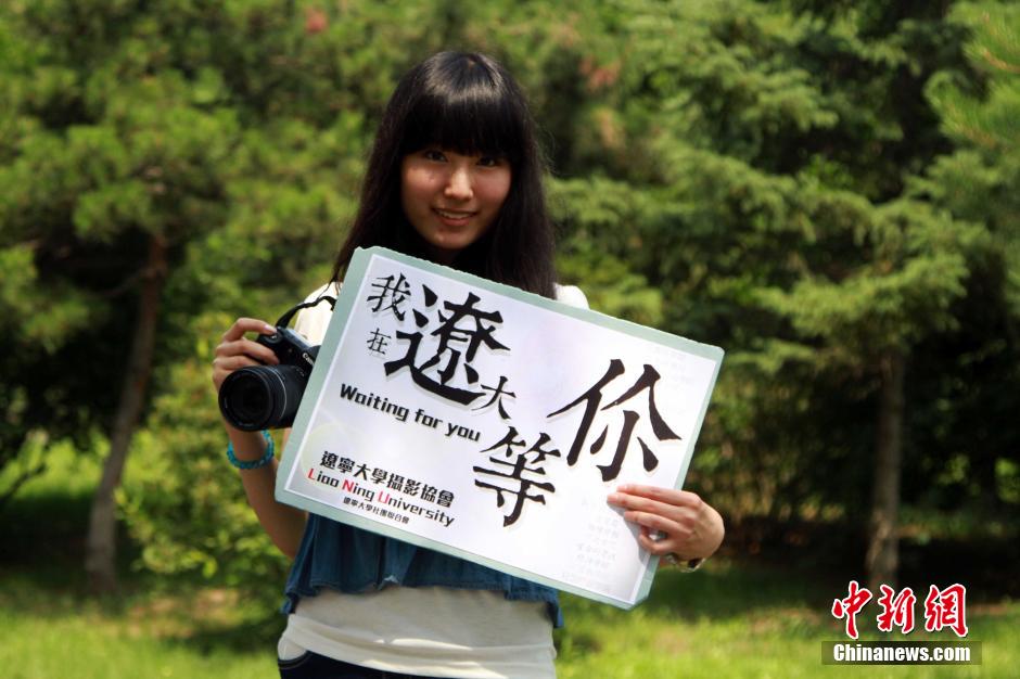 6月23日,美女拿著“我在遼大等你!的牌子在拍照片。當(dāng)日, 遼寧大學(xué)攝影協(xié)會推出一組遼大創(chuàng)意“招生名片”照片,數(shù)位帥哥靚妹更是抓人眼球。中新社發(fā) 于海洋 攝
