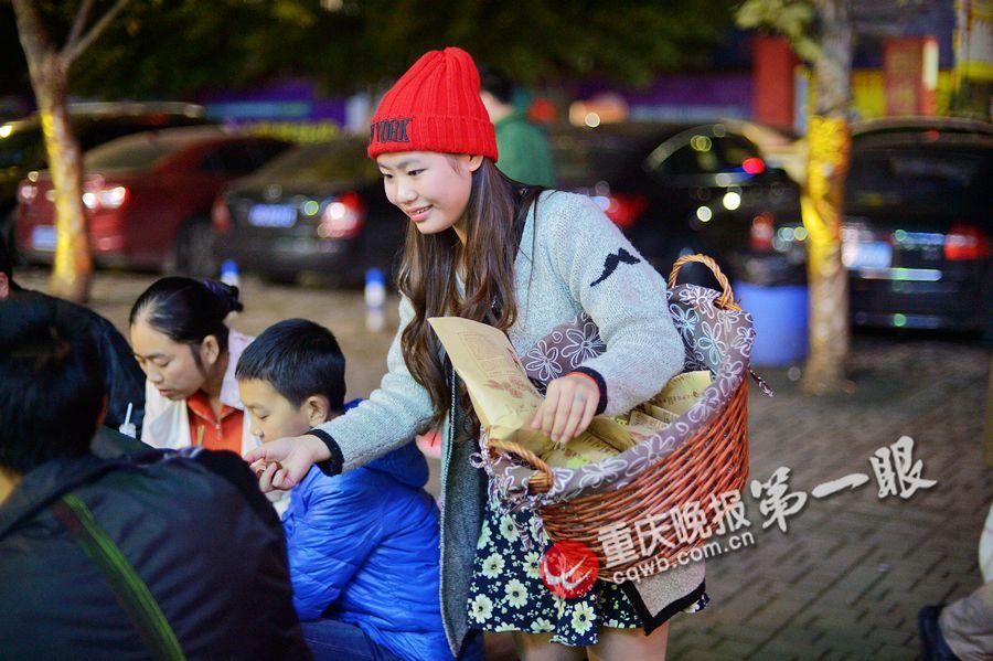 她今年21歲,有著這個(gè)年紀(jì)的青春靚麗。每天晚上,她都會(huì)出現(xiàn)在重慶冉家壩、大石壩、觀(guān)音橋等喝夜啤酒的地方,手上挎?zhèn)€裝滿(mǎn)熱板栗的花籃子叫賣(mài)。這兩年來(lái),從她的籃子里賣(mài)出的板栗已經(jīng)有30多噸,而她也成了江北、渝北夜市有名的板栗妹妹。