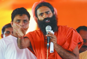 3日,新德里,計劃發起反腐敗絕食抗議行動的印度瑜伽大師拉姆德夫(右)向支持者講話。