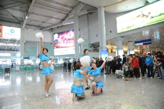 為穩定旅客情緒,大連機場請來美女拉拉隊員跳操,引來眾多旅客圍觀。新青年網