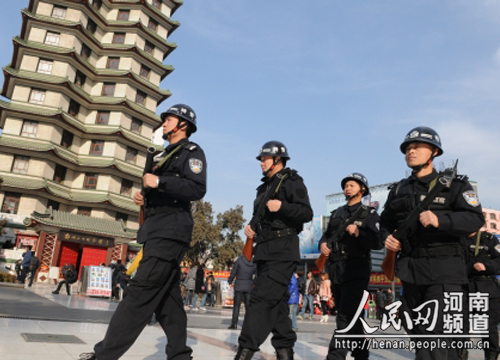 從1月31日起開始至大年初八,鄭州特警將奔赴市區各大廣場和主干道開展武裝巡邏,為綠城守歲。
