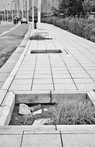 昨日,記者來到鄭東新區(qū)商務外環(huán)路,在商務外環(huán)路與商務西三街交叉口發(fā)現(xiàn),商務外環(huán)路人行道上有一排整齊的樹坑,大略一數(shù),共計45個樹坑。這些樹坑呈正方形,長寬約有1米,每個樹坑相距約3米。樹坑大多長滿野草,有的樹坑內(nèi)堆滿生活垃圾。這一場景與郁郁蔥蔥的周邊環(huán)境很不協(xié)調(diào)。