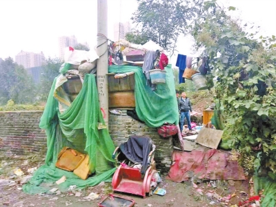 他們從花園路劉莊到鄭上路,走了近2個小時。走到鄭上路須水河西岸時,發現在一塊荒蕪的墳地中,有一窩棚,隱約看到有身影在走動。近前看到,一位瘦黑的老人站在雨里,正在一簡陋土灶上煮面條。老人身上的衣服已淋濕,陪老人的是一條流浪狗,狗是老人撿的。窩棚很小,僅能容下一人,蜷縮著才能躺下。由于窩棚漏雨,鋪蓋內也是濕的。