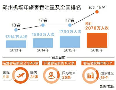 據(jù)鄭州機(jī)場(chǎng)相關(guān)負(fù)責(zé)人介紹,2014年鄭州機(jī)場(chǎng)旅客吞吐量突破1580萬(wàn)人次,同比增長(zhǎng)20%,增速位居全國(guó)20個(gè)大型機(jī)場(chǎng)首位。