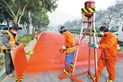 “機動車道6米寬,鋪設‘綠道’的自行車道也為6米寬。看慣了灰黑色的路面,在看到色彩明銳的‘綠道’后肯定覺得眼前一亮。‘綠道’只是叫法,并不是說道路外觀一定是綠色的,在景觀設計中,‘綠道’往往有著更深更廣的內涵。”工程負責人呂先生告訴記者,彩色瀝青厚度僅為1到2毫米,壽命在5年以上,具有警示、防滑、降噪、美觀等特點。“我國‘綠道’通常以警示色紅色為主打,主要作用是打造人車分離模式,供騎車者和步行者休閑使用。”