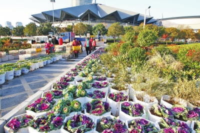 “嘿,快看,真美!感覺好像瞬間穿越到了絢麗多彩的春季!”昨日中午,在鄭東新區CBD商務內環,幾名市民指著花壇內一大片黃、紅、紫三色相間的鮮花說。在這里,記者看到一撥撥工作人員正忙著將一盆盆鮮花擺放到預先設置好的花架上。姿態秀逸、枝葉扶蘇,綴滿鮮艷奪目紅果的南天竹十分吸睛;各種色彩亮麗的花朵,則為冬日的鄭州增添了一抹迷人的色彩;株形如牡丹,葉片形態美觀多變,觀賞性不輸鮮花的甘藍更是隨處可見。